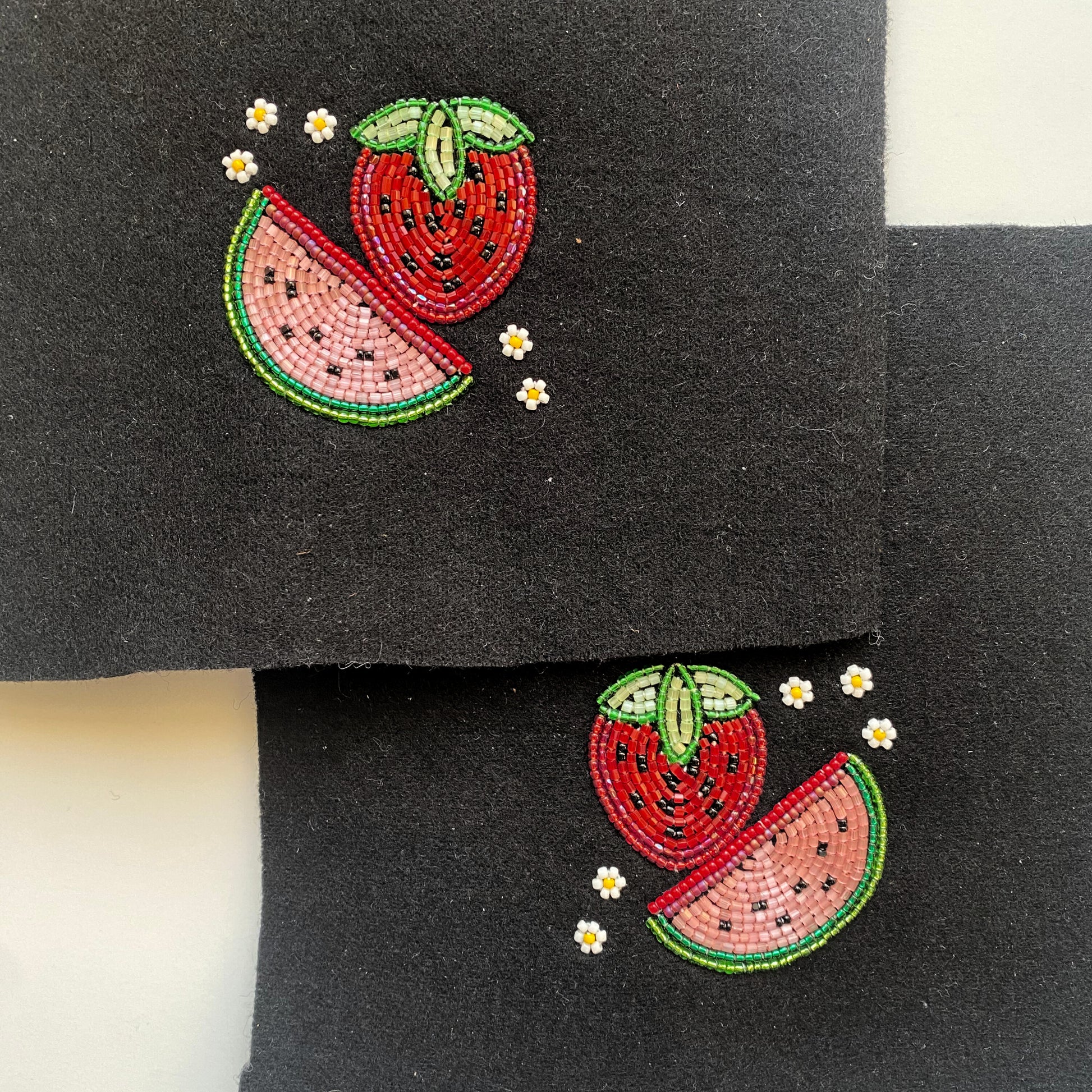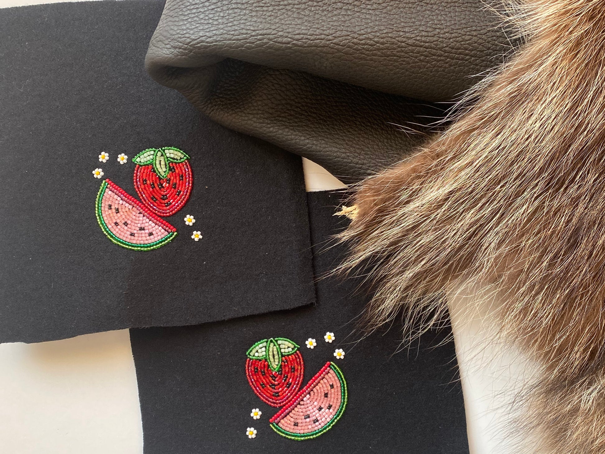 - Cultural Significance: This design is infused with symbolism from both cultures. Indigenous people from Turtle Island honour the strawberry. Within Haudenosaunee traditions we hold the heart berry in high regard. This special pair of moccasins also honours Palestinian culture. When it became illegal by the occupation to use the Palestinian flag, they began to use the watermelon as a sign of their culture as it shares the same colours as their flag. This beadwork blends both images together to create a piece of meaningful and unique cultural synthesis.